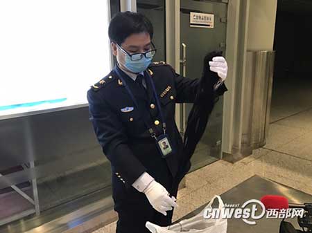 西安咸陽機(jī)場出入境檢驗(yàn)檢疫局科長楊安寧:“行李包裝中有一團(tuán)人發(fā),打開以后,油膩膩的、臟兮兮的,而且目測還帶有白色的像可疑頭皮屑一樣的東西,也散發(fā)出來一種不好聞的異味。”